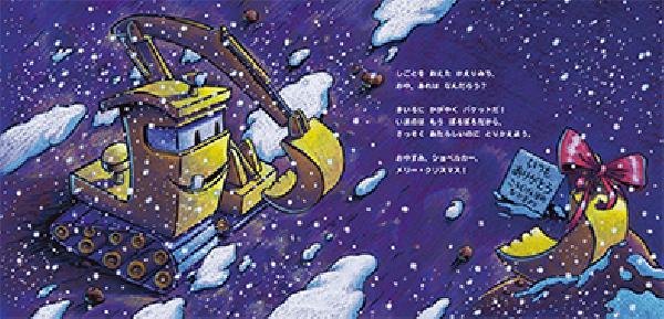 広い広い工事現場では、ブルドーザーやショベルカー、ミキサー車、ダンプカー、クレーン車が、今年最後の大仕事。朝から晩まで働いて、クリスマス・イブにようやくまにあいました。帰り道、働く車たちが見つけたのは自分たちへのとってもすてきなプレゼント!