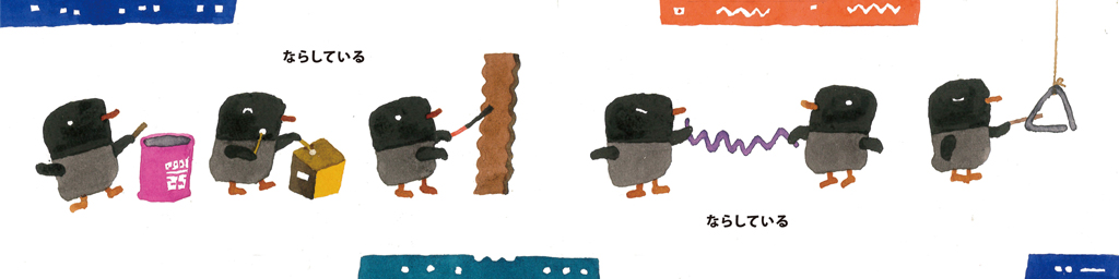 ペンギンたちが色んなものをならしています こっちでも そっちでも おもいおもいに きままに すると・・・ ならすのは いいね!