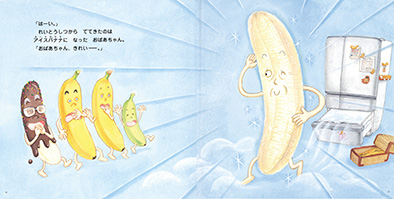 ある日のこと、バナナくんは、バナナの皮を踏んで転んでしまいました。「だれ? 皮を脱ぎっぱなしにしたのは」すると、「はーい!」皮を脱いだおじいちゃんが、チョコバナナに変身して現れました。続いて「はーい!」おばあちゃんも皮を脱いで、冷凍バナナになって登場。これから、パーティーに出るんだって。バナナくんがついていくと…