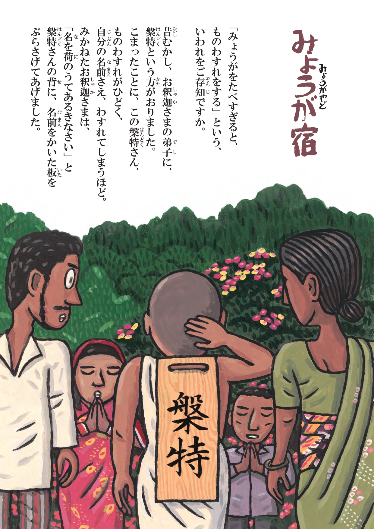みょうがを食べると物忘れをするという言い伝えを利用して、お客のものをとってしまおうと悪巧みをする宿屋の夫婦。宿屋を訪れた旅の商人にみょうが料理を振る舞い、商人が宿屋を後にした部屋から金目のものを探します。