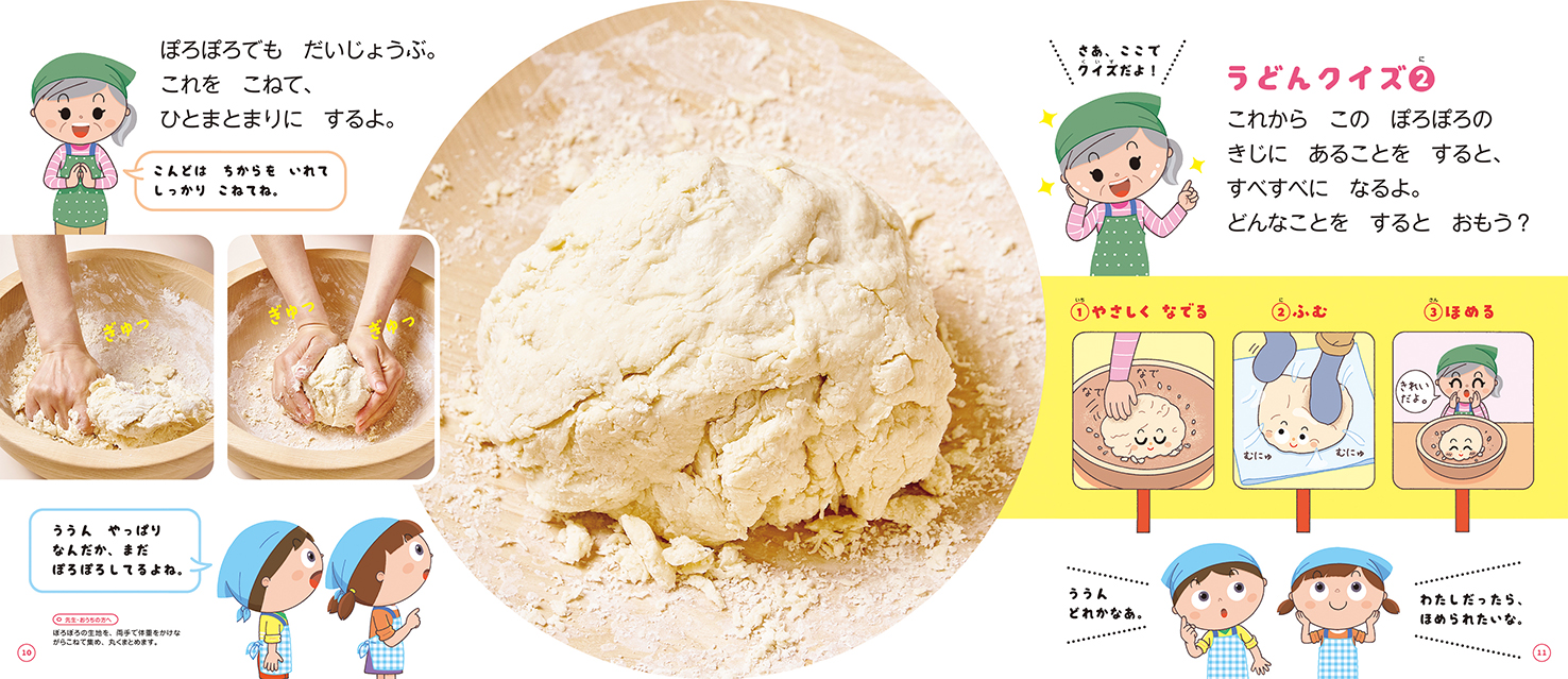 小麦粉と塩水を混ぜて、こねて、寝かせて…撮りおろしの写真でうどんの作り方を紹介。材料が変化する様子を観察していきます。絵本の写真を追いながらうどんが作れます。クイズを織り交ぜ、作り方のポイントを楽しく知ることができます。