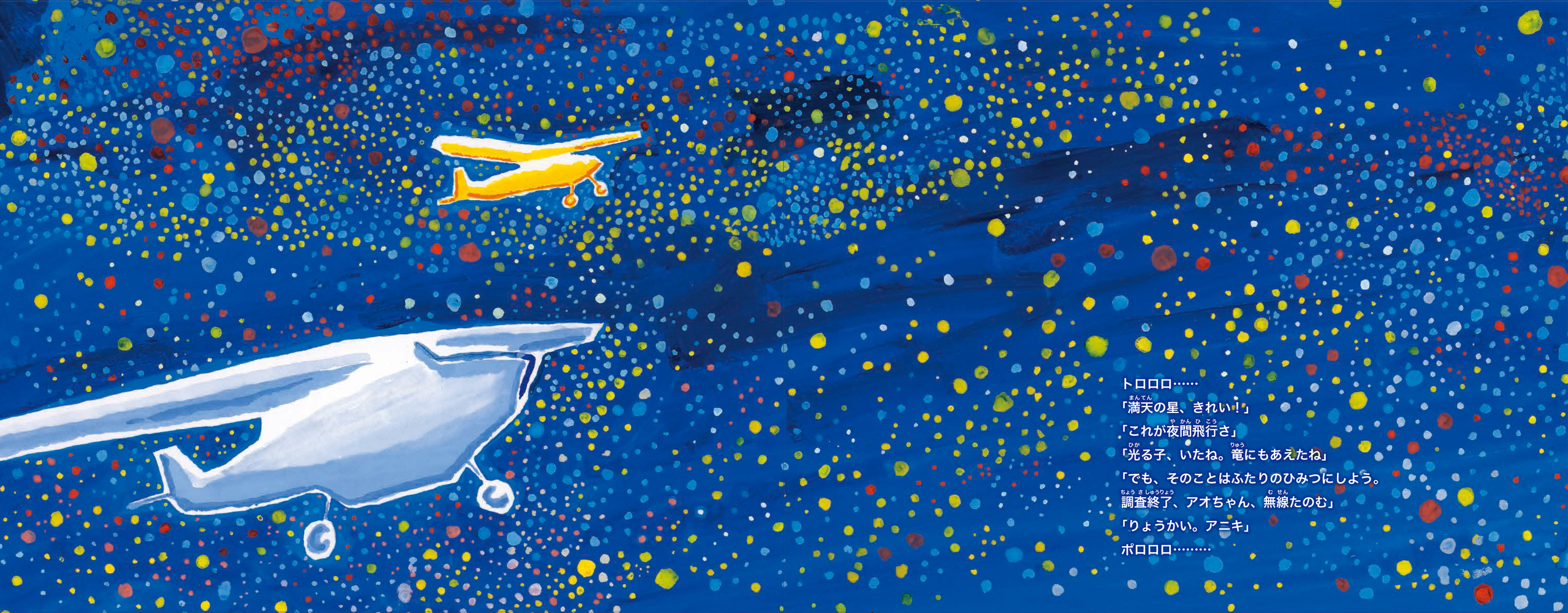 そして、満天の星のもと、光る子たちが小走りにあらわれ、光る石のまわりでおどり、あそぶ……ーー
