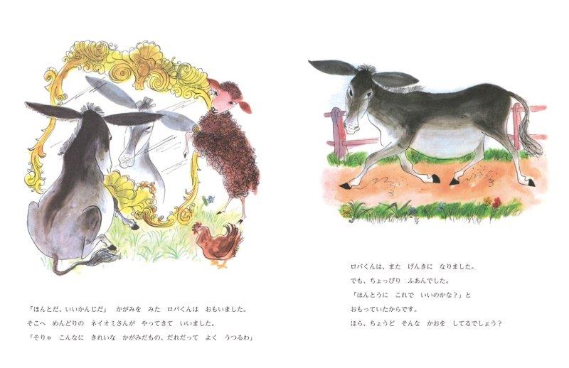 ロバくんはある日水に映った自分を見て、長くてピンと立った耳がかっこ悪いと思い込み、友達の動物たちの耳をマネしてみますが…。